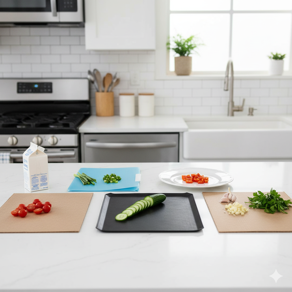 夕食の準備中、お肉を切ろうとしたら、さっき野菜を切ったまな板が濡れていてすぐに使えない。そんな日常のささいなストレスを感じた経験はありませんか?急いでいる時に限って、まな板の代用方法が思い浮かばず、調理が滞ってしまうこともありますよね。衛生面を考えて、肉や魚と野菜でまな板を分けたいけれど、何枚も用意するのは収納場所に困る、という方も多いでしょう。実は、まな板がない時でも、身近にあるもので手軽に代用することが可能です。例えば、飲み終わった牛乳パックや、料理でよく使うクッキングシート、さらにはアルミホイルやラップも工夫次第で立派なまな板代わりになります。これらの代用品は、特に使い捨てできるため、生肉や魚を切る際の雑菌の繁殖や色移り、臭い移りの心配を軽減してくれる優れものです。この記事では、そうした緊急時に役立つまな板の代用アイデアから、それぞれのメリット・デメリット、そして、もっと料理を快適にしたいと考えるあなたのために、日々の調理が劇的に楽になる専用のまな板シートまで、幅広くご紹介します。あなたのキッチンライフをより清潔で、より効率的に変えるヒントがきっと見つかるはずです。